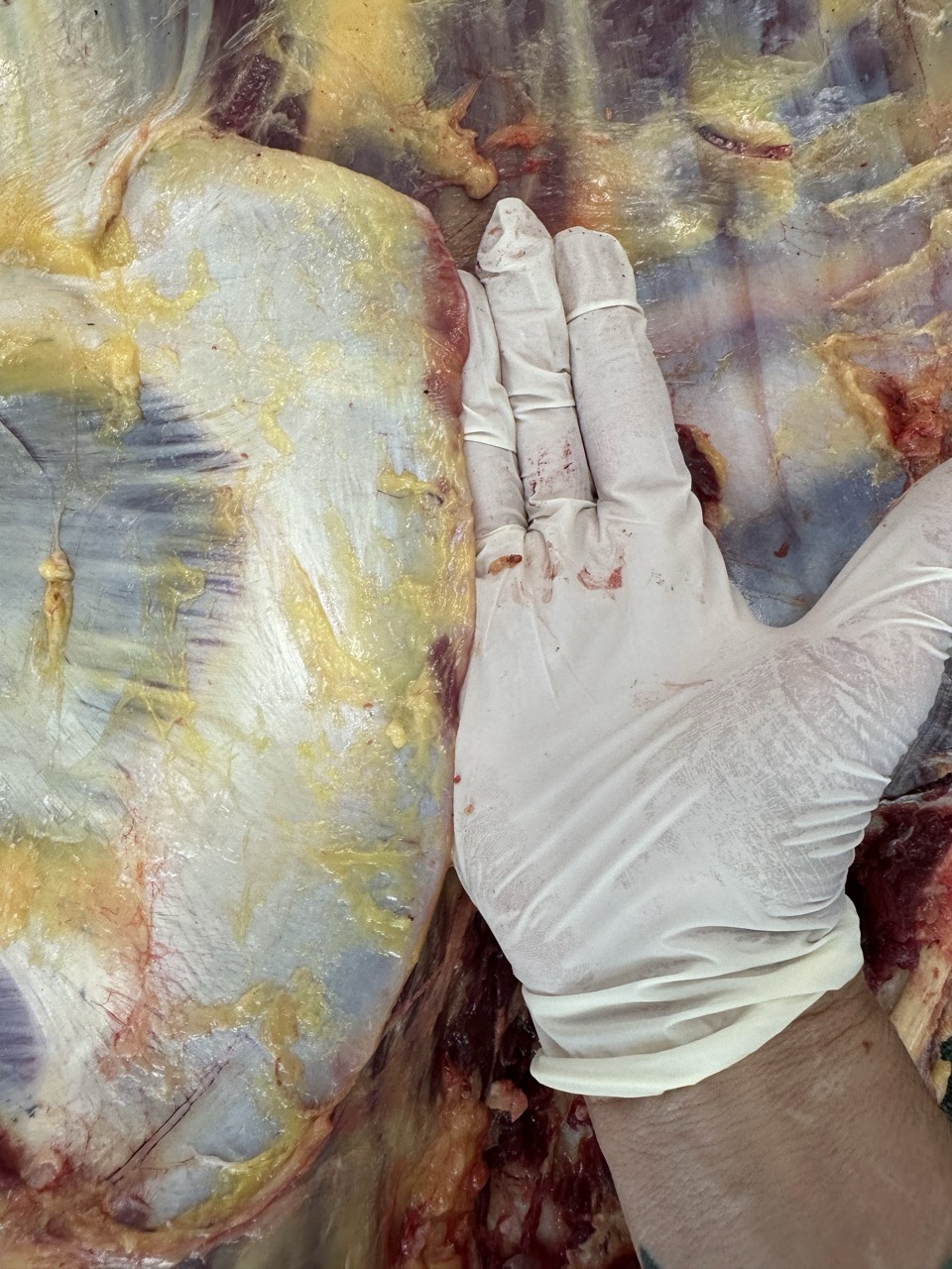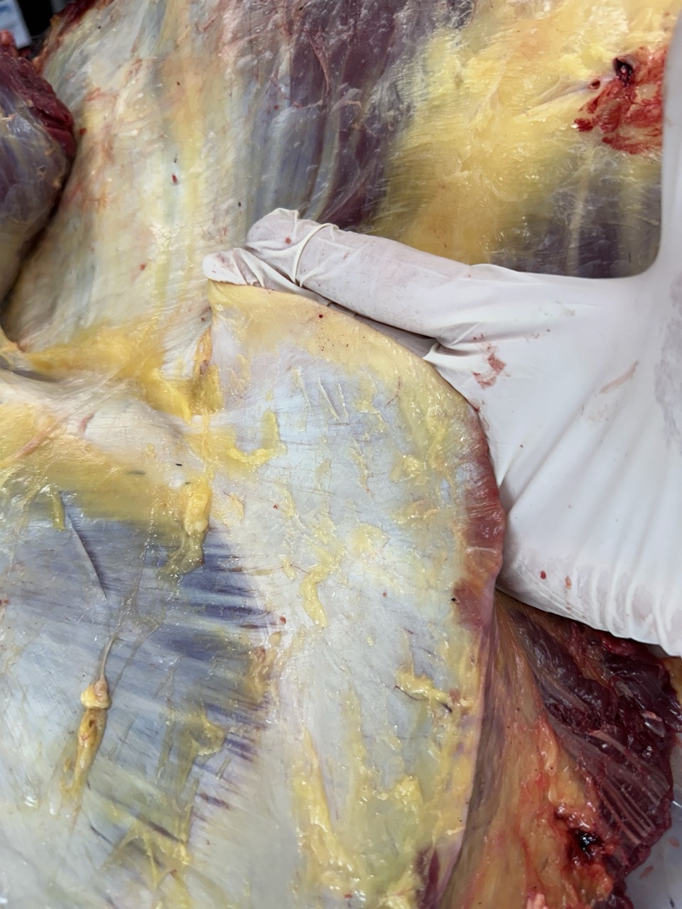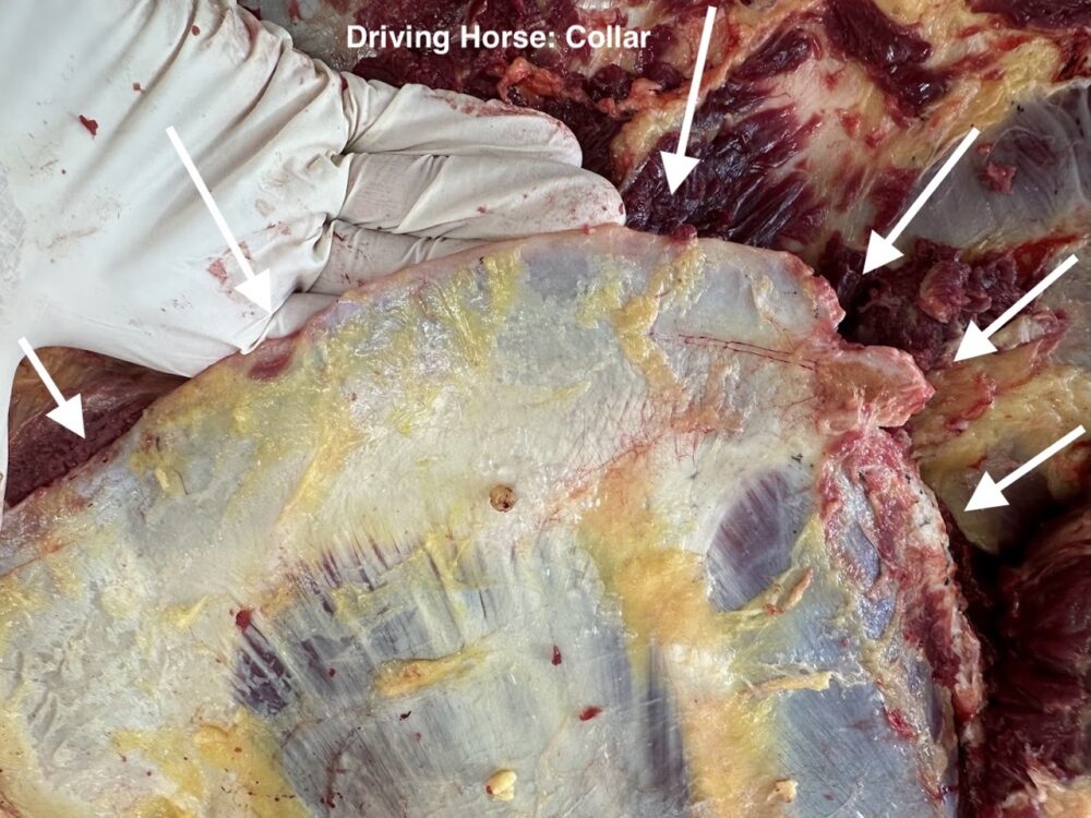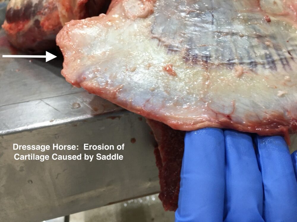 Below are images of scapular damage occurring by equipment. The first is a draft horse that wore a collar to the front margins of the scapular bone and cartilage. The second image is of a dressage horse with extensive erosion of the caudal cartilage caused from saddle pressure. The last two images are from the same horse on necropsy. This horse was ridden western where the saddle was placed on top of the scapula.