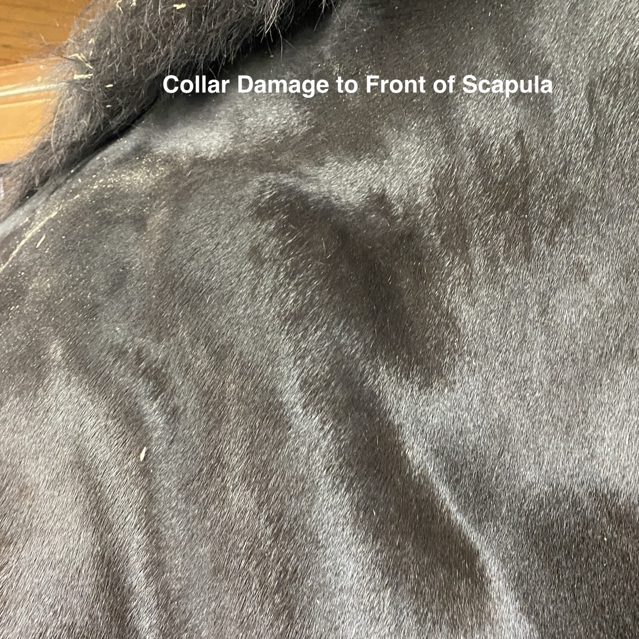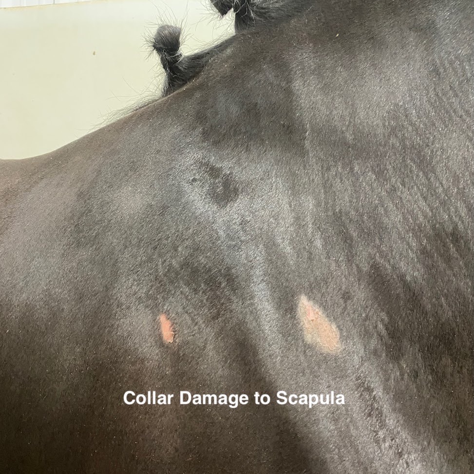 Below are images of scapular damage occurring by equipment. The first is a draft horse that wore a collar to the front margins of the scapular bone and cartilage. The second image is of a dressage horse with extensive erosion of the caudal cartilage caused from saddle pressure. The last two images are from the same horse on necropsy. This horse was ridden western where the saddle was placed on top of the scapula.