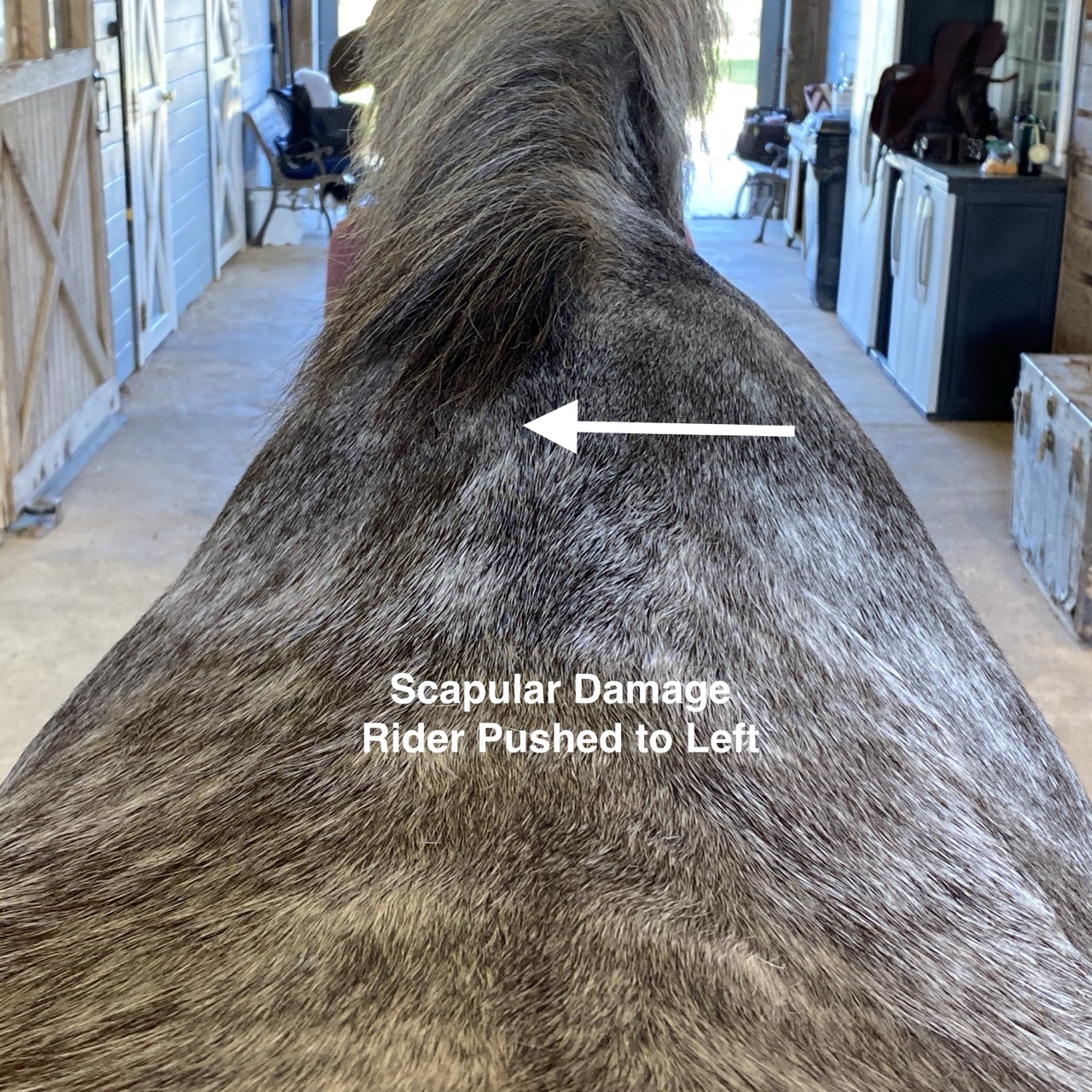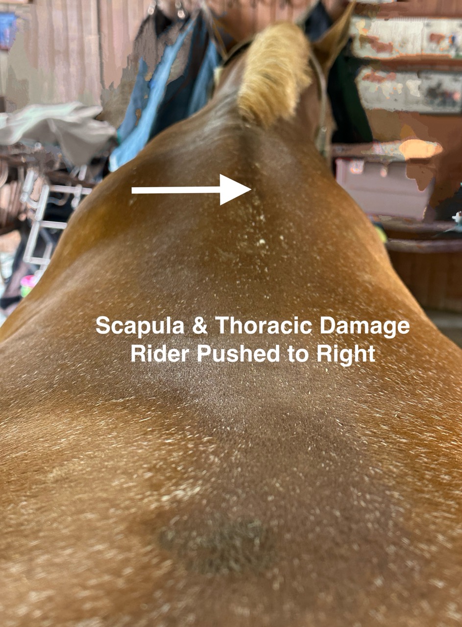 Let’s discuss the biomechanics of all the images put together as an example for you to understand when riding a horse. I must preface this by saying, you need to envision yourself riding a horse while reading this. If a horse is bulged on the left scapula and flat on the right scapula, the rider will be pushed NO MATTER WHAT to the right with every single stride of the LEFT front limb. The rider will feel like one stirrup is longer than the other, with the right feeling longer, even though it is not. The rider will continually put more weight in the left stirrup/side of the horse which will create even MORE DAMAGE to the scapula and regional structures, thus exacerbating the trauma and damage occurring with EVERY SINGLE STRIDE of the left front. Imagine jumping the horse with this scenario? Jumping is not the problem, except for the fact that the rider is sitting off to the right (more pressure in the left side/stirrup), as it is the LANDING that creates more repetitive trauma with every single time the horse jumps. This will make the horse drift right AND the horse will hang its right front limb because the scapula is being completely “squashed”(technical word for compressed), which is WHY it is flatter. Thus, it is LANDING that we see the behavioral clinical signs of the horse throwing its neck up, swishing of the tail non-stop, bolting, rearing or refusing to jump because of the prediction of sharp pain on landing! To take this even further, the BULGED side, which is the left side in this horse example, PROHIBITS the horse from moving LEFT, thus moving in a counter-arched or “bulged” like frame, going LEFT!