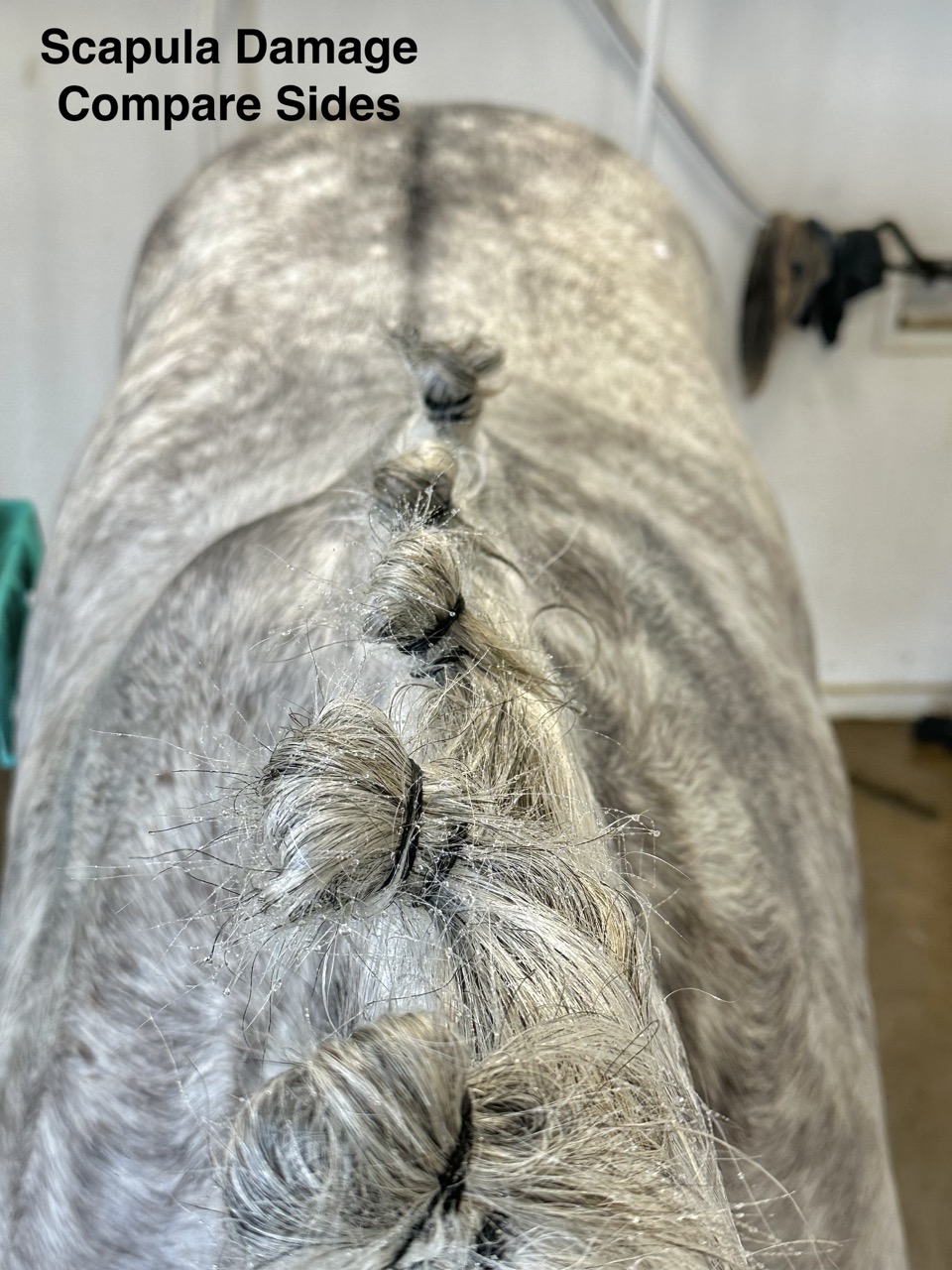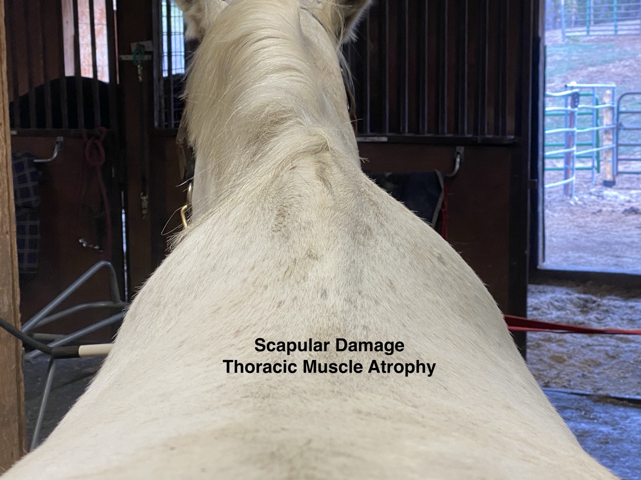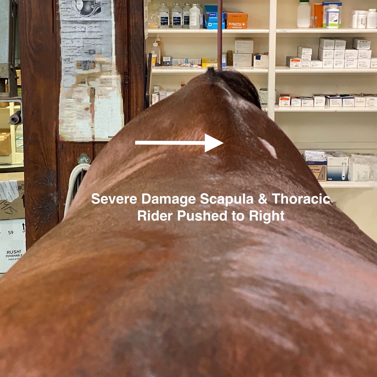 Below are 28 images of injury and damage not only to the scapula, but also to the surrounding attachments to the thoracic spine and ribcage due to the attachment of the girth or surcingle. The injured structures include muscle damage, fascia and fascial attachment damage, ligament damaged, vascular damage, nerve damage and bone damage. Everything in that REGION can be injured and have damage, thus affects/effects normal functional biomechanical movement. I have an entire library of these images that I have taken of my patient population AND their front feet. Yes, another abyss of logical scientific data that no one else has recognized in the veterinary profession, showing a distinct pattern and direct correlation between scapular damage and how the horses feet grow. That information will be in a future blog.